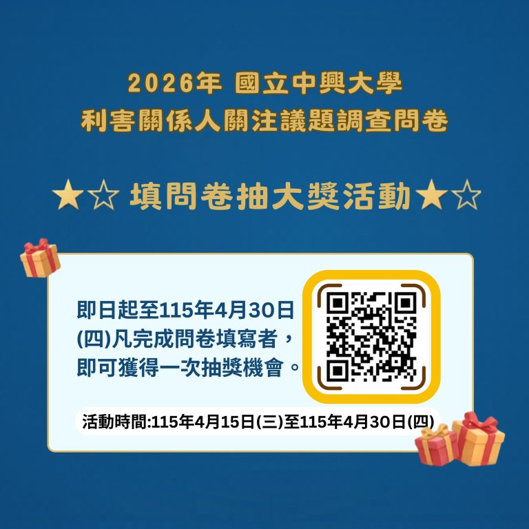 各位先進 您好: 為了更加瞭解國立中興大學永續績效,邀請您針對問卷中,興大「校務治理」、「環境治理」、「社會參與」每項議題勾選您的關心程度,作為本…